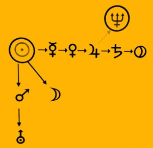 Ráadásul ez a nagyon jóindulatú, szerencsehozó planéta (Fortuna Major) diszponálja a hierarchikus és tradicionális Szaturnuszt, ami viszont a Plútót, úgyhogy a Jupiter-Plútó összecsapás inkább a közönségnek szánt Isteni színjáték, mintsem kibékíthetetlen ellentét. A háttérben ott lapulnak a közös motivációk – el akarják érni, hogy képesek legyünk végre a változtatásra. A zord fényszög (Jupiter-Plútó kvadrát) ellenére szeretetteli noszogatással (Vénusz-Jupiter trigon) késztet minket az eddig még nem megvalósított céljaink elérésére. Ez persze fáradhatatlan, időt igénylő, sziszifuszi feladat (Szaturnusz), de pont emiatt szisztematikus, megalapozott, reális, átgondolt (Merkúr trigon Szaturnusz) lépések és döntések révén végrehajtott tervezett módosítások életünk fonalán.
